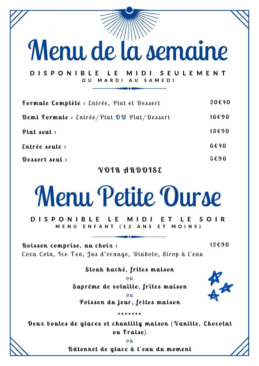 Bonjour,Un peu plus tard que d’habitude… voici le menu de la semaine de votre restaurant La Grande Ourse à Loudéac 😋 Il est disponible tous les midis du mardi au samedi.Presque complet vendredi midi nous avons encore de la place samedi 🤩C’est aussi avec plaisir que nous vous annonçons l’arrivée de notre nouvelle serveuse. Le sourire de Jouliana sera désormais aussi à votre service 😊Portez vous bien 👍