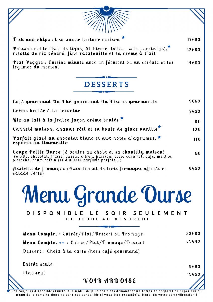🤗 Les congés sont terminés pour l’équipe de La Grande Ourse, bien reposée et pleine de bonnes résolutions c’est avec plaisir que nous vous recevrons à nouveau à notre table pour cette nouvelle année 🤩 Tout en vous souhaitant encore nos meilleurs vœux, la santé surtout, voici le menu de la semaine 😋 disponible tous les midis du mardi au samedi.Portez vous bien 👍