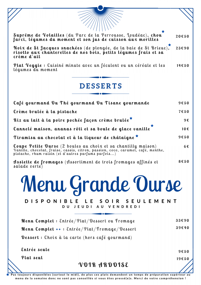 Bonjour,Un peu plus tard que d’habitude… voici le menu de la semaine de votre restaurant La Grande Ourse à Loudéac 😋 Il est disponible tous les midis du mardi au samedi.Presque complet vendredi midi nous avons encore de la place samedi 🤩C’est aussi avec plaisir que nous vous annonçons l’arrivée de notre nouvelle serveuse. Le sourire de Jouliana sera désormais aussi à votre service 😊Portez vous bien 👍